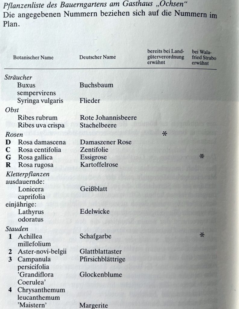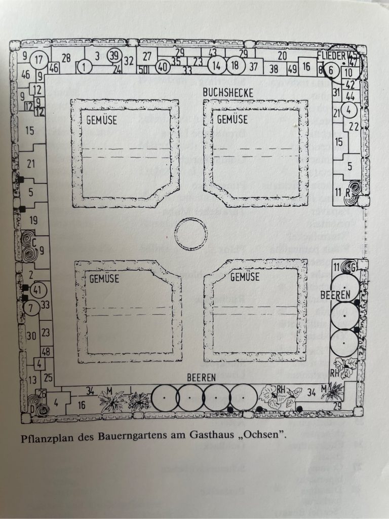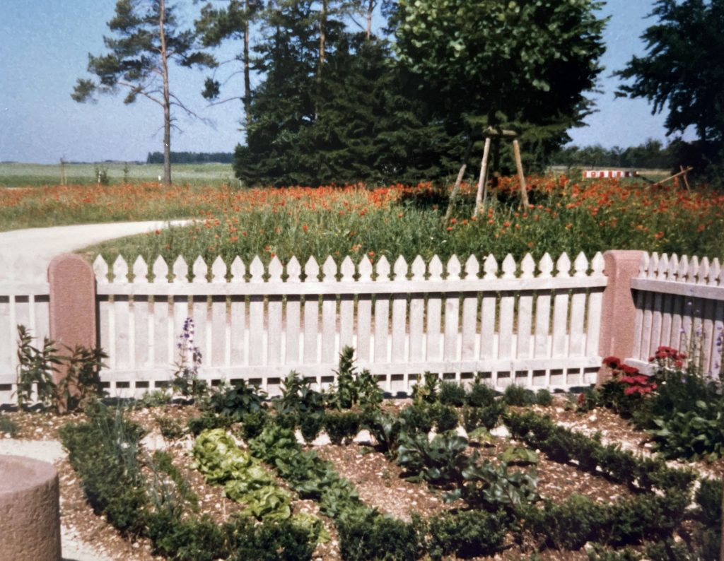 So sieht der Ochsengarten heute aus – fast vierzig Jahre später! Von Buchshecken eingerahmt wachsen verschiedene Gemüsesorten, entlang des Zaunes haben sich Rosen und andere Blühpflanzen etabliert.